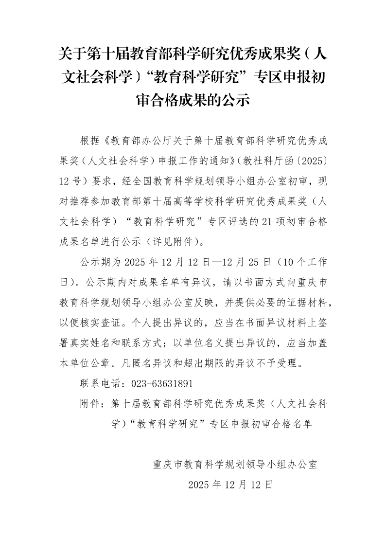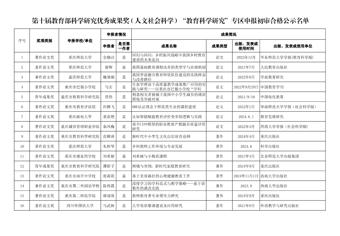 关于第十届教育部科学研究优秀成果奖(人文社会科学)“教育科学研究”专区申报初审合格成果的公示