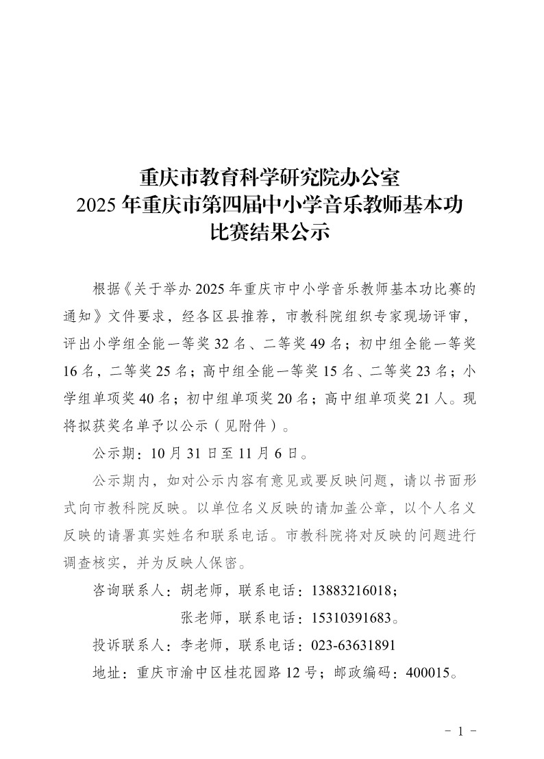 重庆市教育科学研究院办公室2025年重庆市第四届中小学音乐教师基本功比赛结果公示
