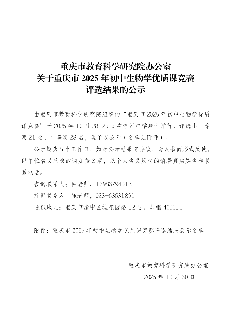 重庆市教育科学研究院办公室关于重庆市2025年初中生物学优质课竞赛评选结果的公示