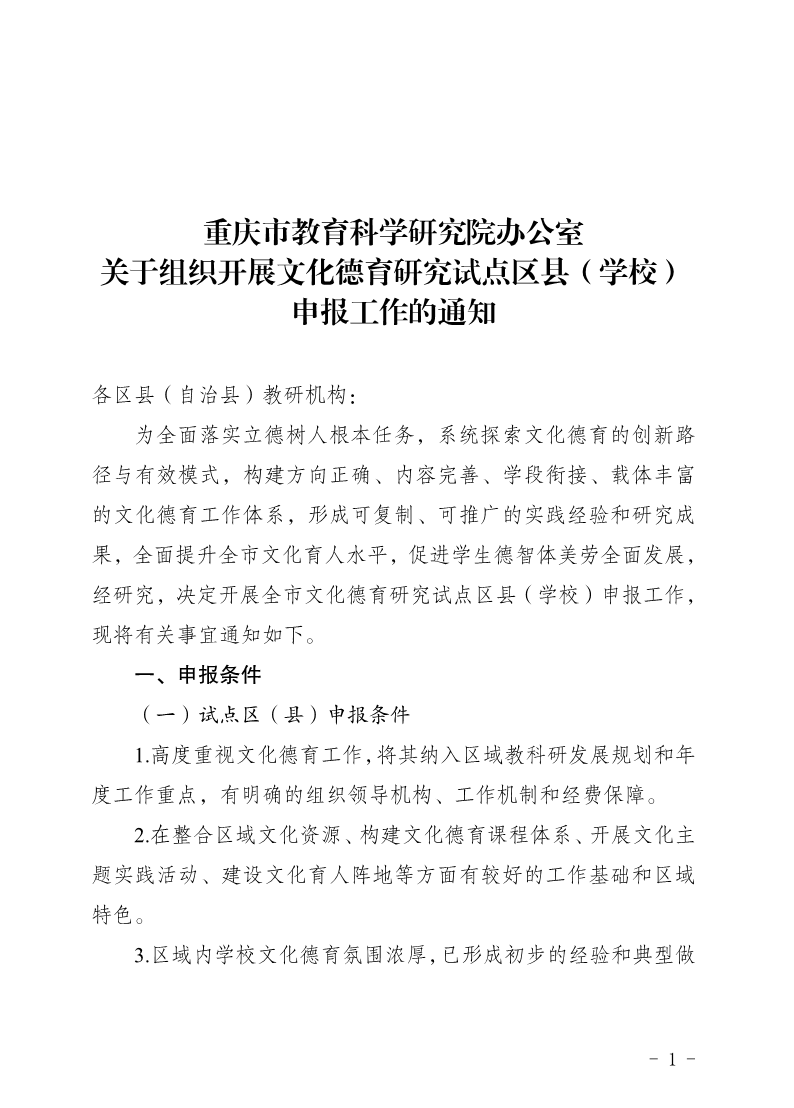重庆市教育科学研究院办公室关于组织开展文化德育研究试点区县(学校) 申报工作的通知