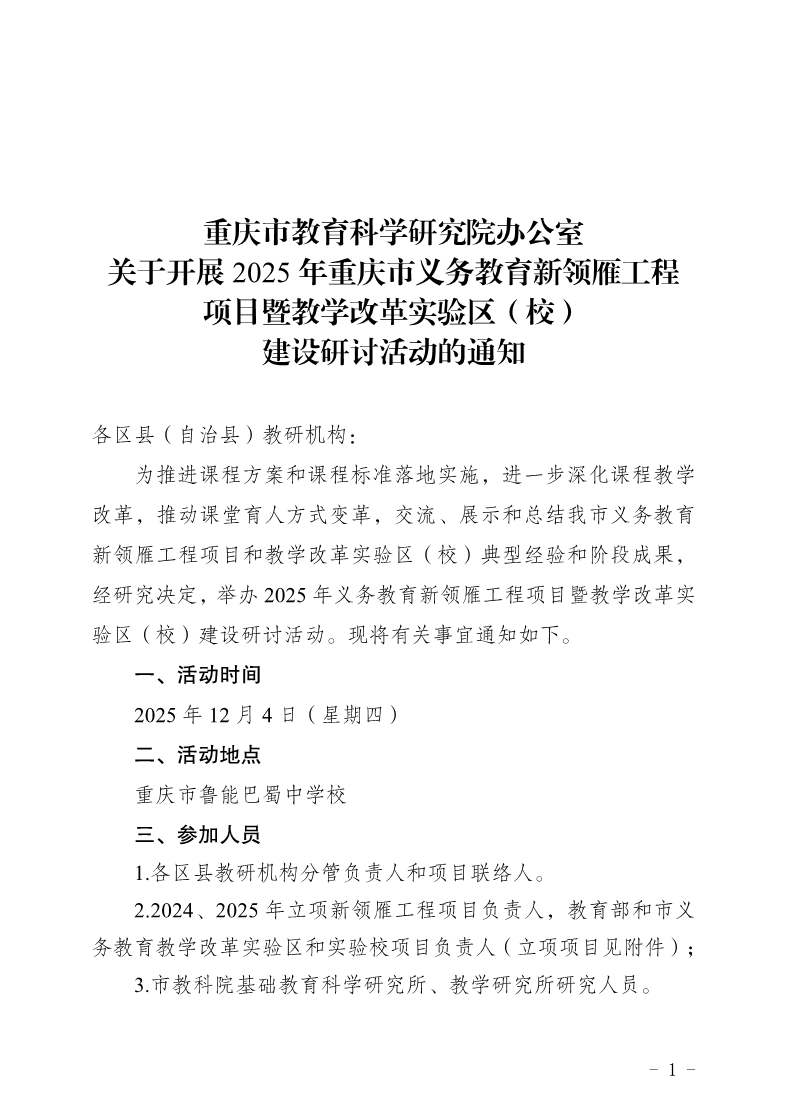 重庆市教育科学研究院办公室关于开展2025年重庆市义务教育新领雁工程项目暨教学改革实验区(校) 建设研讨活动的通知 作者: 来源: 发布时间:2025年11月12日 点击数: 次 【字体:小 大】 分享到: 【打印正文】
