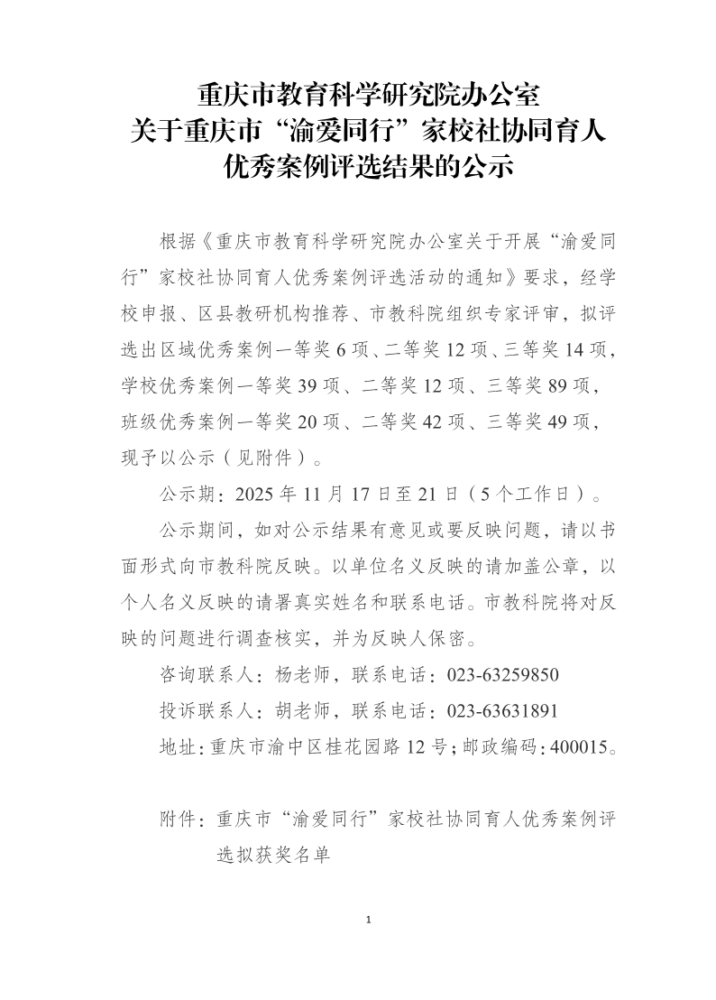 重庆市教育科学研究院办公室关于重庆市“渝爱同行”家校社协同育人优秀案例评选结果的公示