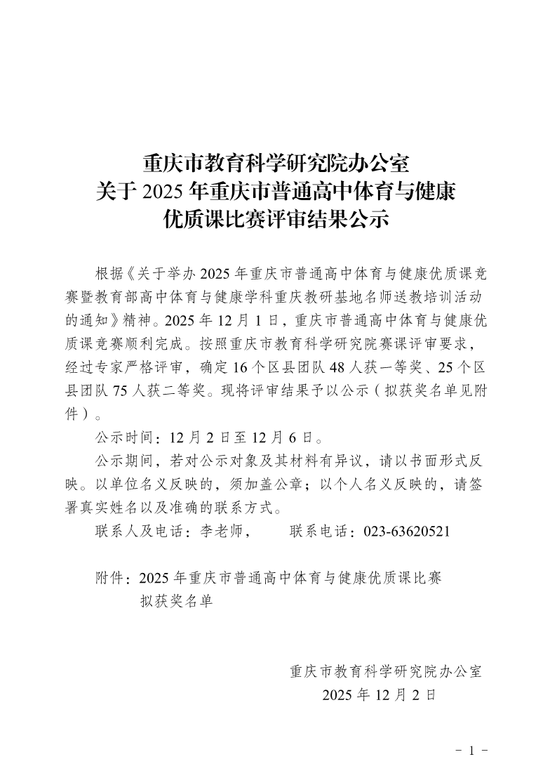 重庆市教育科学研究院办公室关于2025年重庆市普通高中体育与健康优质课比赛评审结果公示