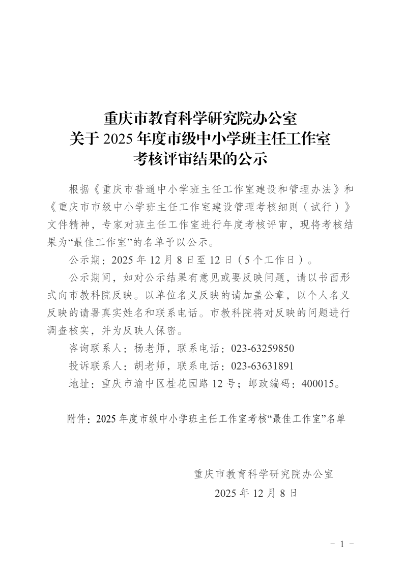 重庆市教育科学研究院办公室关于2025年度市级中小学班主任工作室考核评审结果的公示