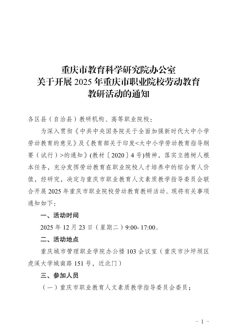 重庆市教育科学研究院办公室关于开展2025年重庆市职业院校劳动教育教研活动的通知