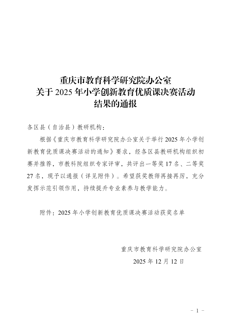 重庆市教育科学研究院办公室关于2025年小学创新教育优质课决赛活动结果的通报