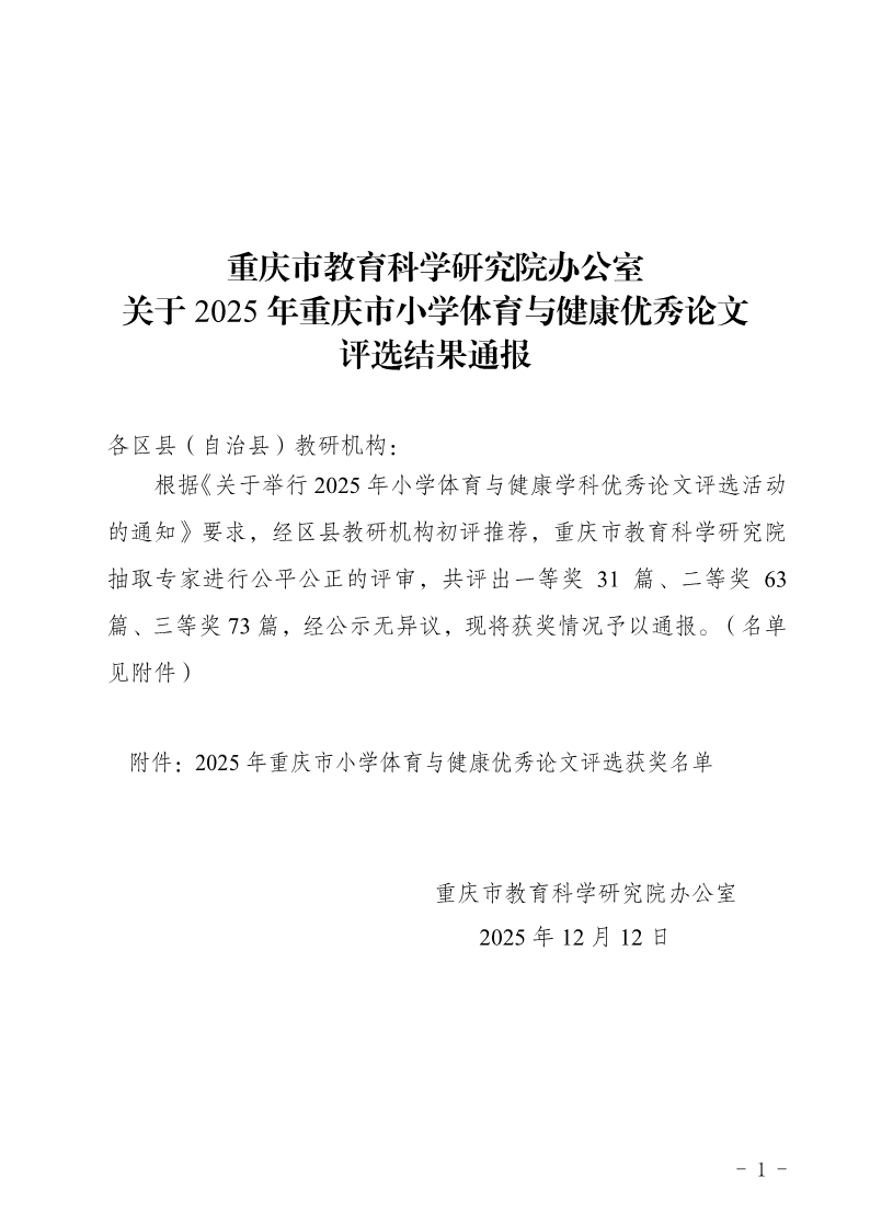 重庆市教育科学研究院办公室关于2025年重庆市小学体育与健康优秀论文评选结果通报