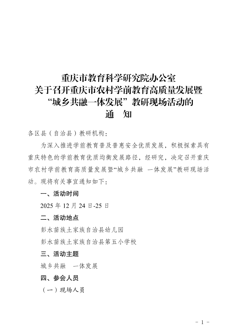 重庆市教育科学研究院办公室 关于召开重庆市农村学前教育高质量发展暨 “城乡共融一体发展”教研现场活动的通知 作者: 来源: 发布时间:2025年12月16日 点击数: 次 【字体:小 大】 分享到: 【打印正文】