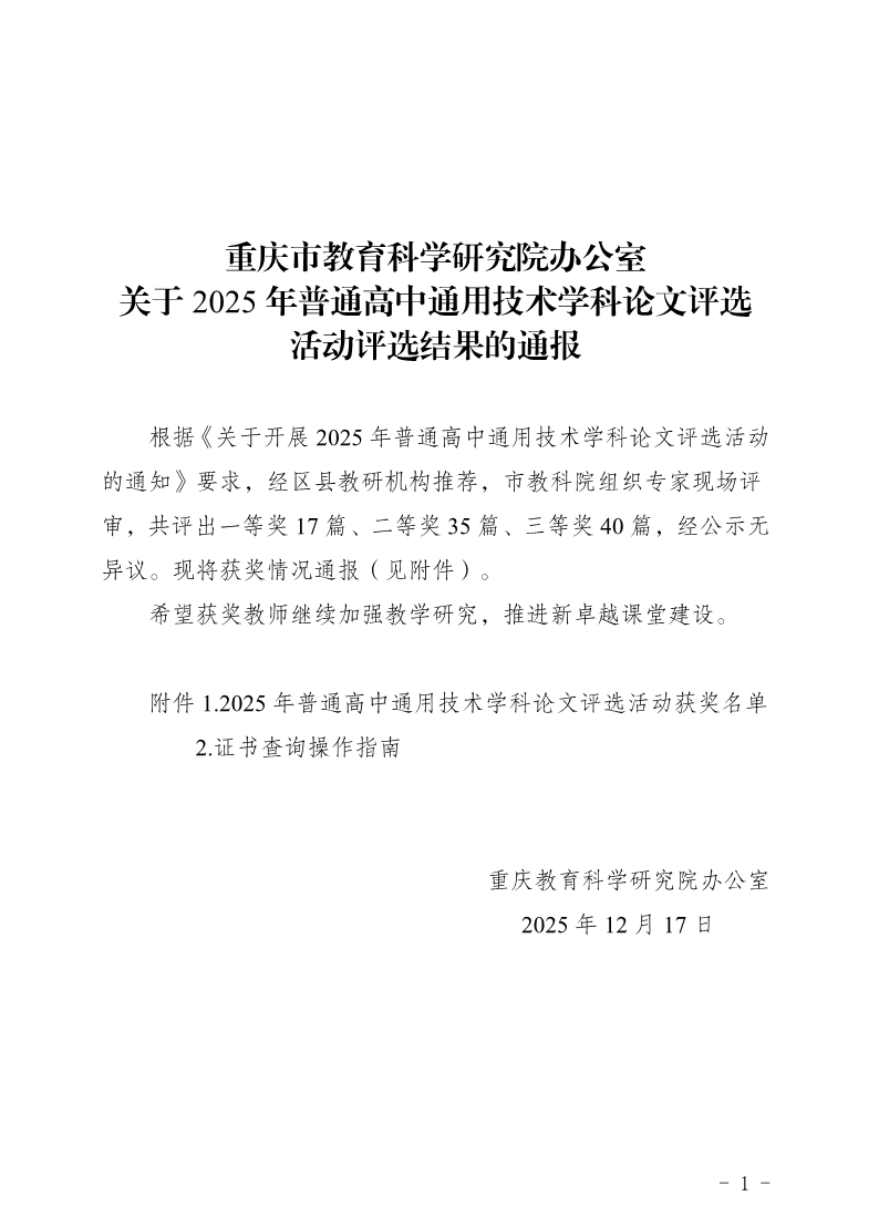 重庆市教育科学研究院办公室关于2025年普通高中通用技术学科论文评选活动评选结果的通报