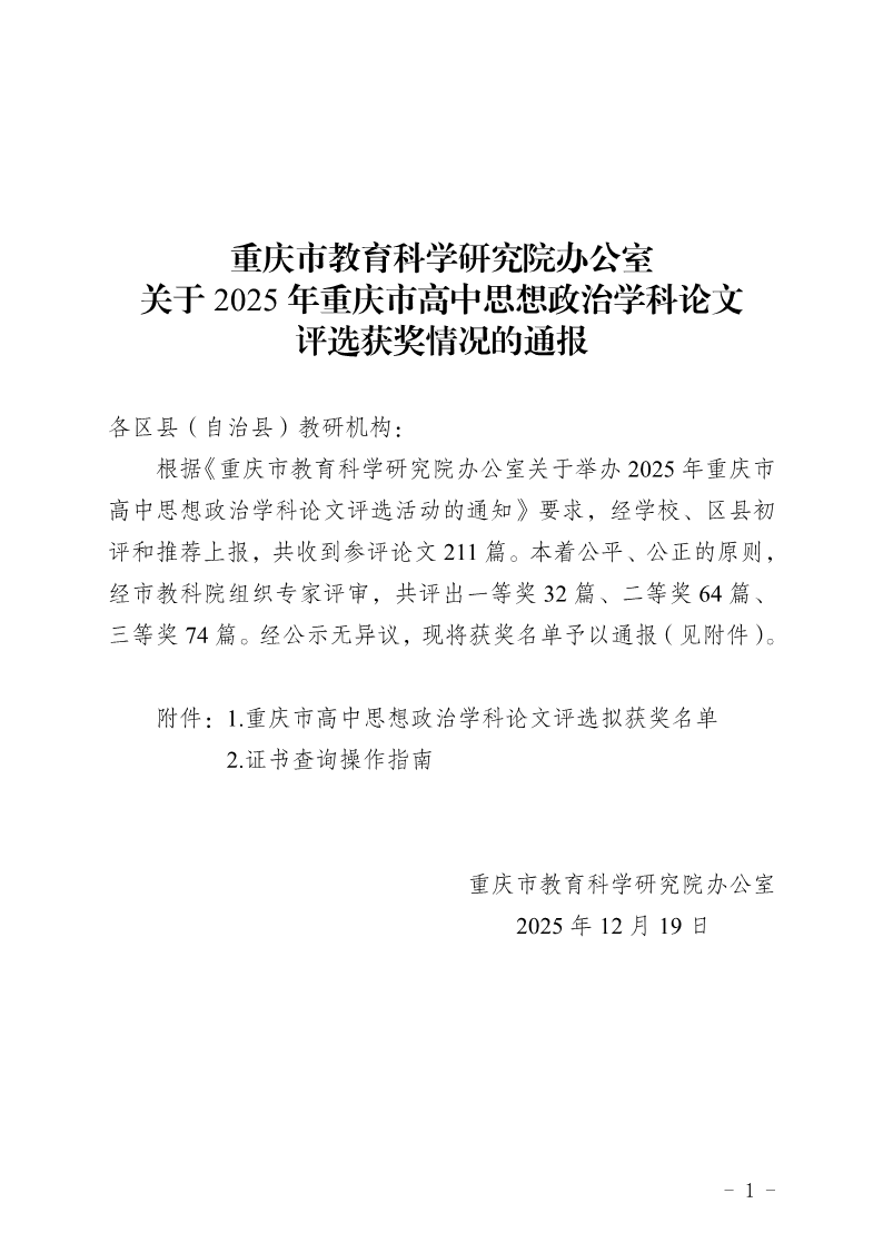 重庆市教育科学研究院办公室关于2025年重庆市高中思想政治学科论文评选获奖情况的通报