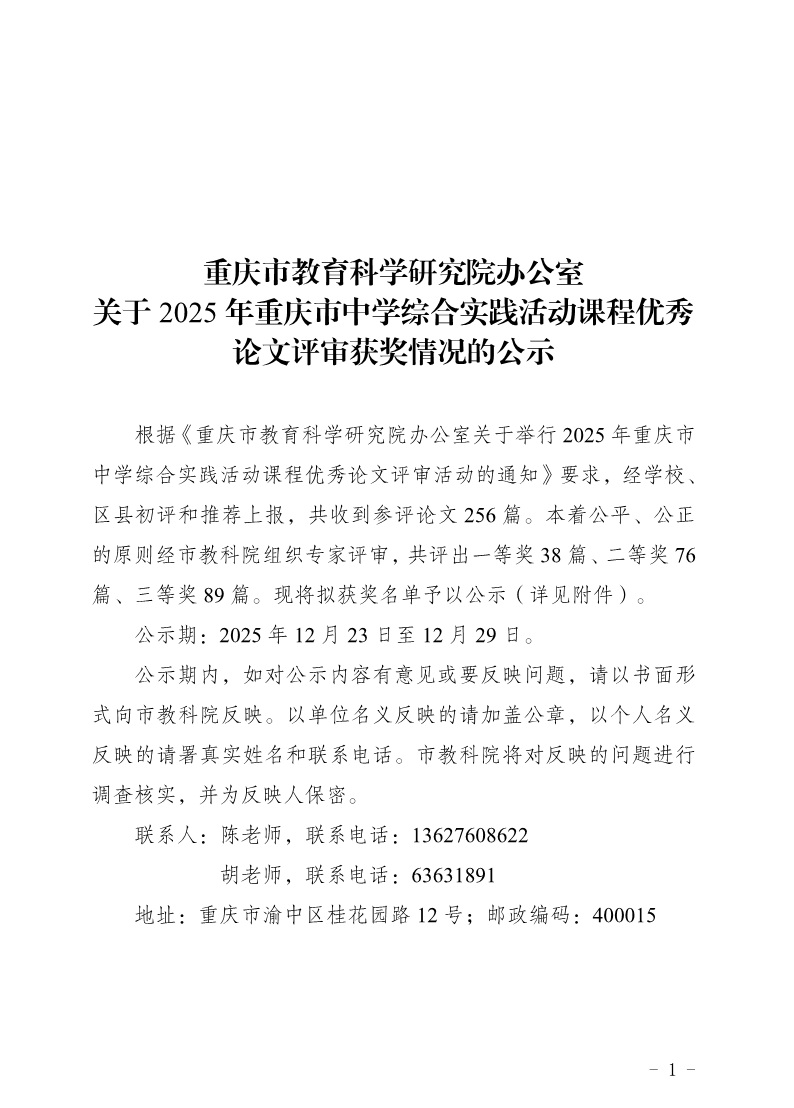 重庆市教育科学研究院办公室关于2025年重庆市中学综合实践活动课程优秀论文评审获奖情况的公示