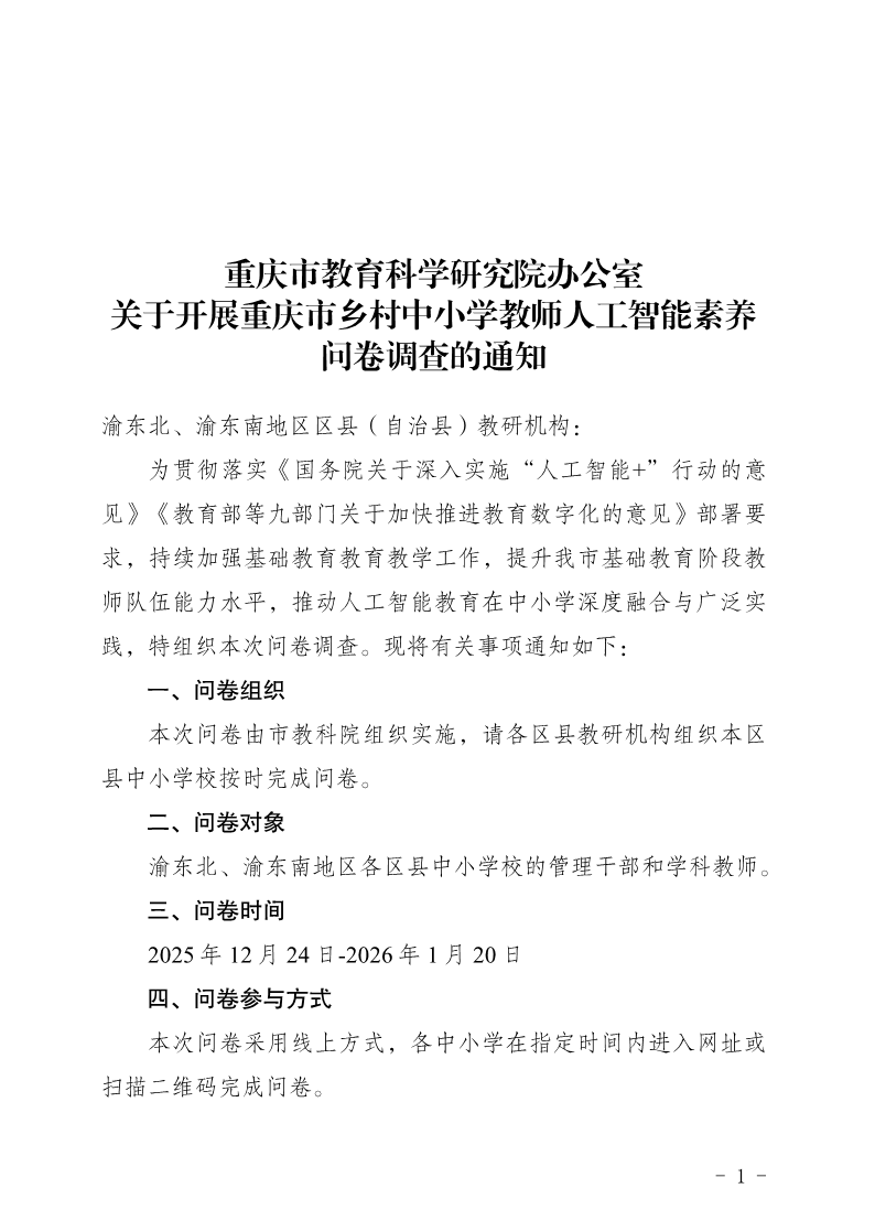 重庆市教育科学研究院办公室关于开展重庆市乡村中小学教师人工智能素养问卷调查的通知