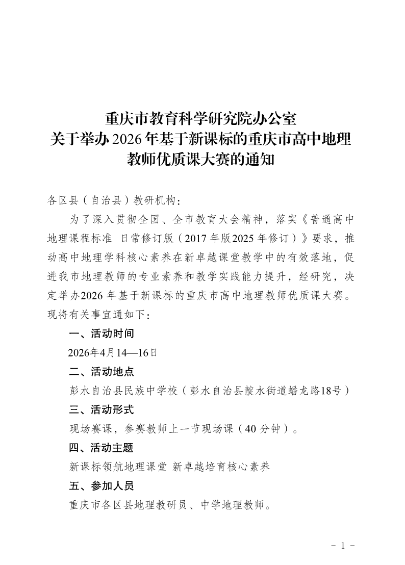 重庆市教育科学研究院办公室关于举办2026年基于新课标的重庆市高中地理教师优质课大赛的通知