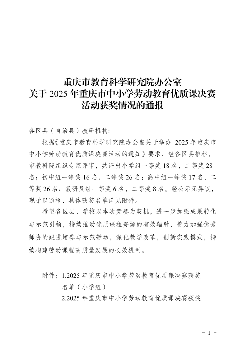重庆市教育科学研究院办公室关于2025年重庆市中小学劳动教育优质课决赛活动获奖情况的通报