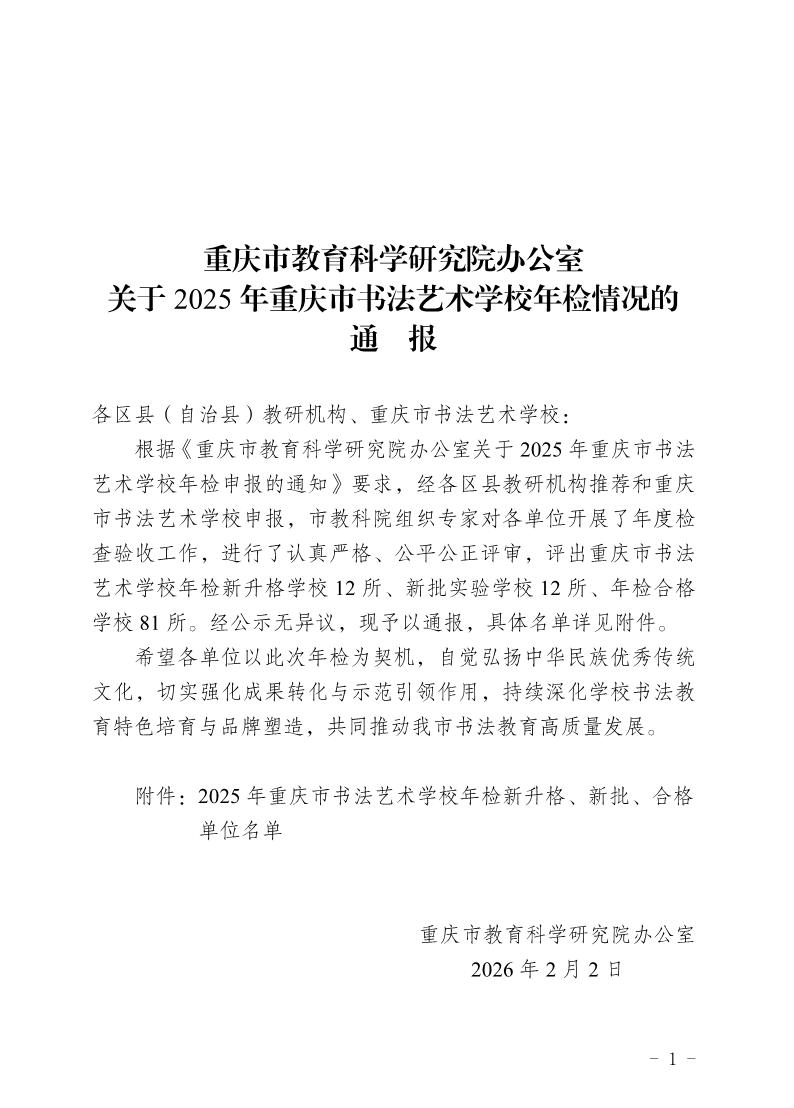 重庆市教育科学研究院办公室关于2025年重庆市书法艺术学校年检情况的通报