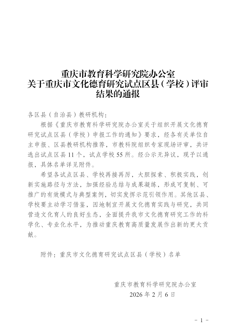 重庆市教育科学研究院办公室关于重庆市文化德育研究试点区县(学校)评审结果的通报