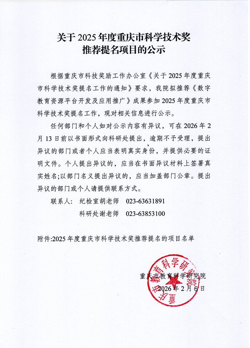 关于2025年度重庆市科学技术奖推荐题名项目的公示