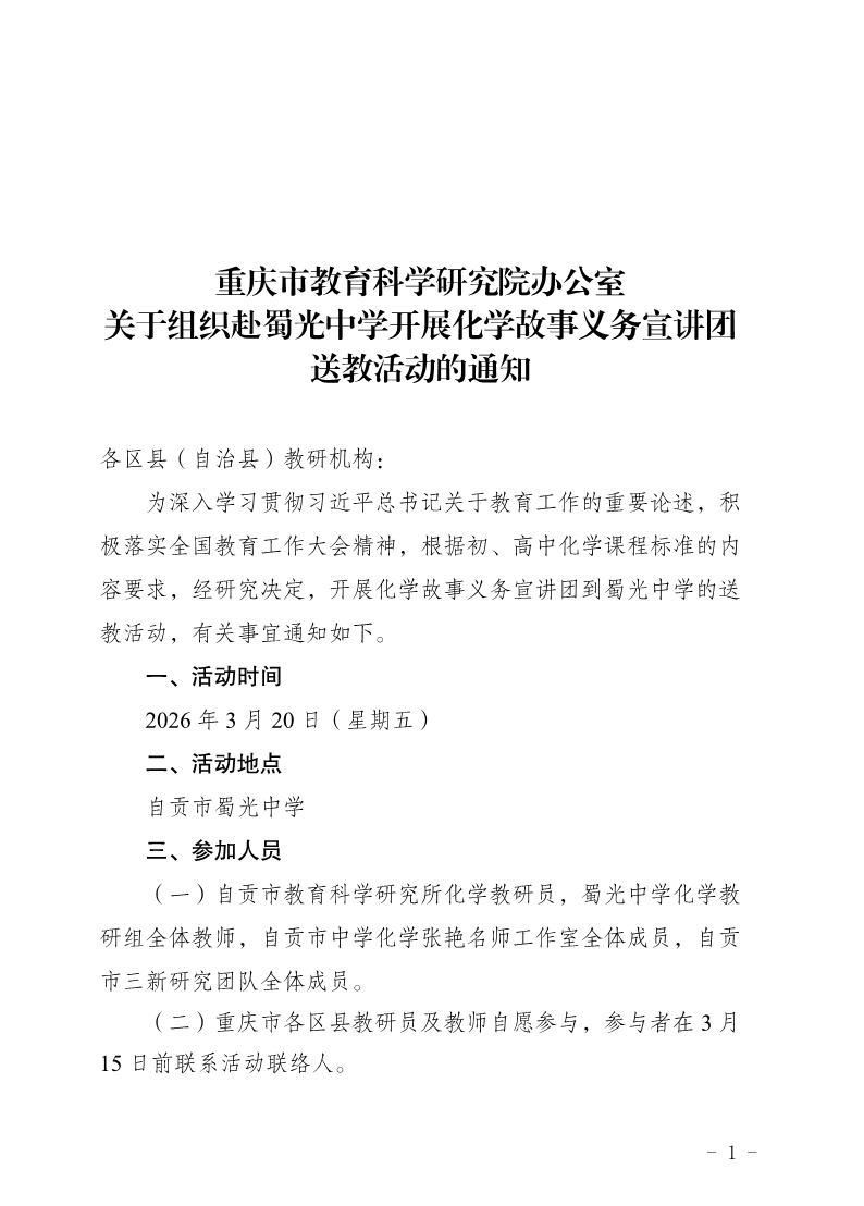 重庆市教育科学研究院办公室关于组织赴蜀光中学开展化学故事义务宣讲团送教活动的通知