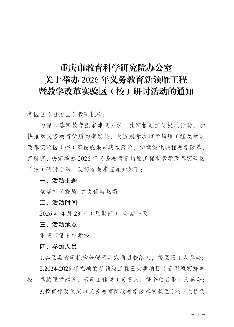 重庆市教育科学研究院办公室关于举办2026年义务教育新领雁工程 暨教学改革实验区(校)研讨活动的通知 作者: 来源: 发布时间:2026年03月31日 点击数: 次 【字体:小 大】 分享到: 【打印正文】