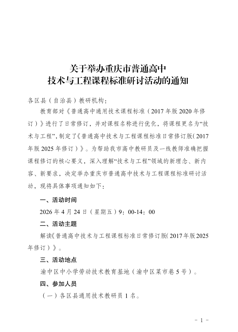 关于举办重庆市普通高中技术与工程课程标准研讨活动的通知