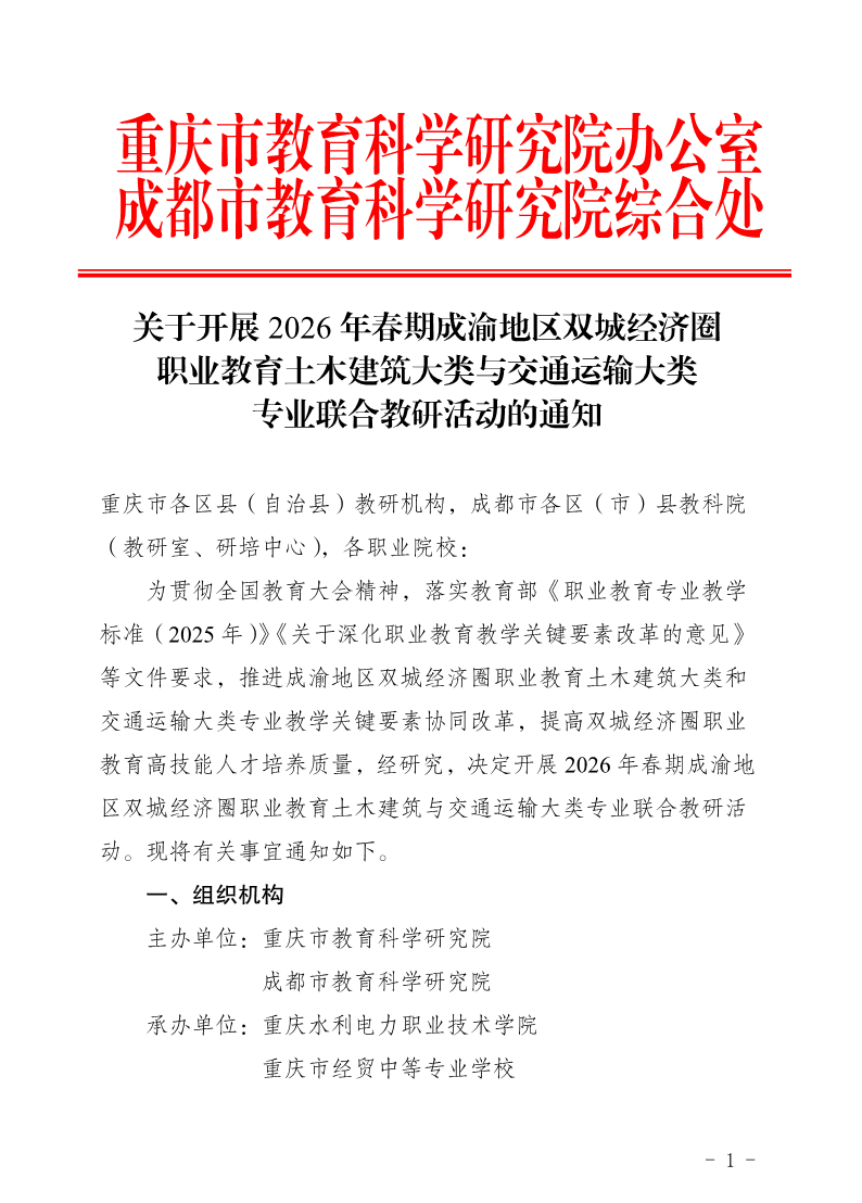 重庆市教育科学研究院办公室 成都市教育科学研究院综合处关于开展2026年春期成渝地区双城经济圈职业教育土木建筑大类与交通运输大类专业联合教研活动的通知 作者: 来源: 发布时间:2026年04月10日 点击数: 次 【字体:小 大】 分享到: 【打印正文】