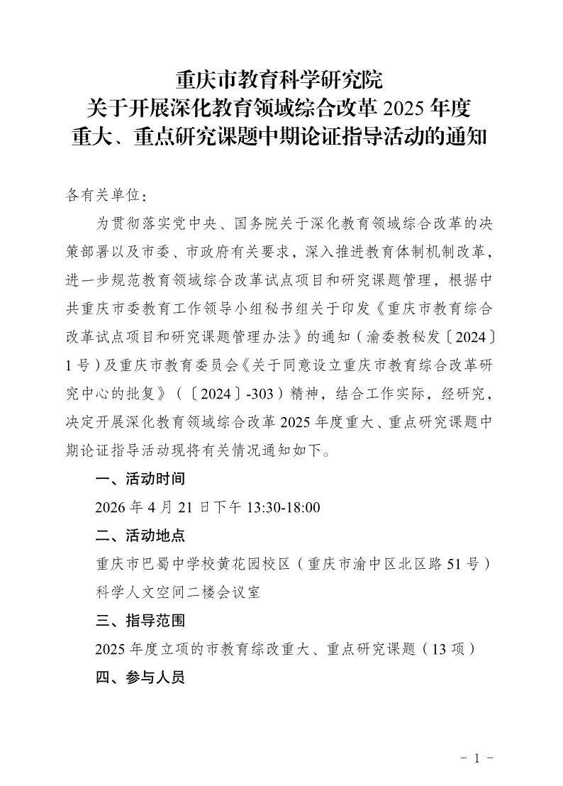 重庆市教育科学研究院关于开展深化教育领域综合改革2025年度重大、重点研究课题中期论证指导活动的通知 作者: 来源: 发布时间:2026年04月16日 点击数: 次 【字体:小 大】 分享到: 【打印正文】
