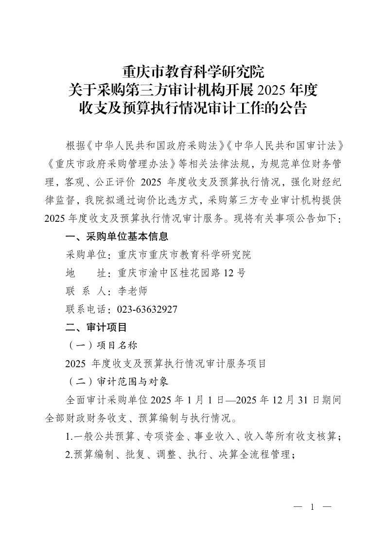重庆市教育科学研究院关于采购第三方审计机构开展2025年度收支及预算执行情况审计工作的公告