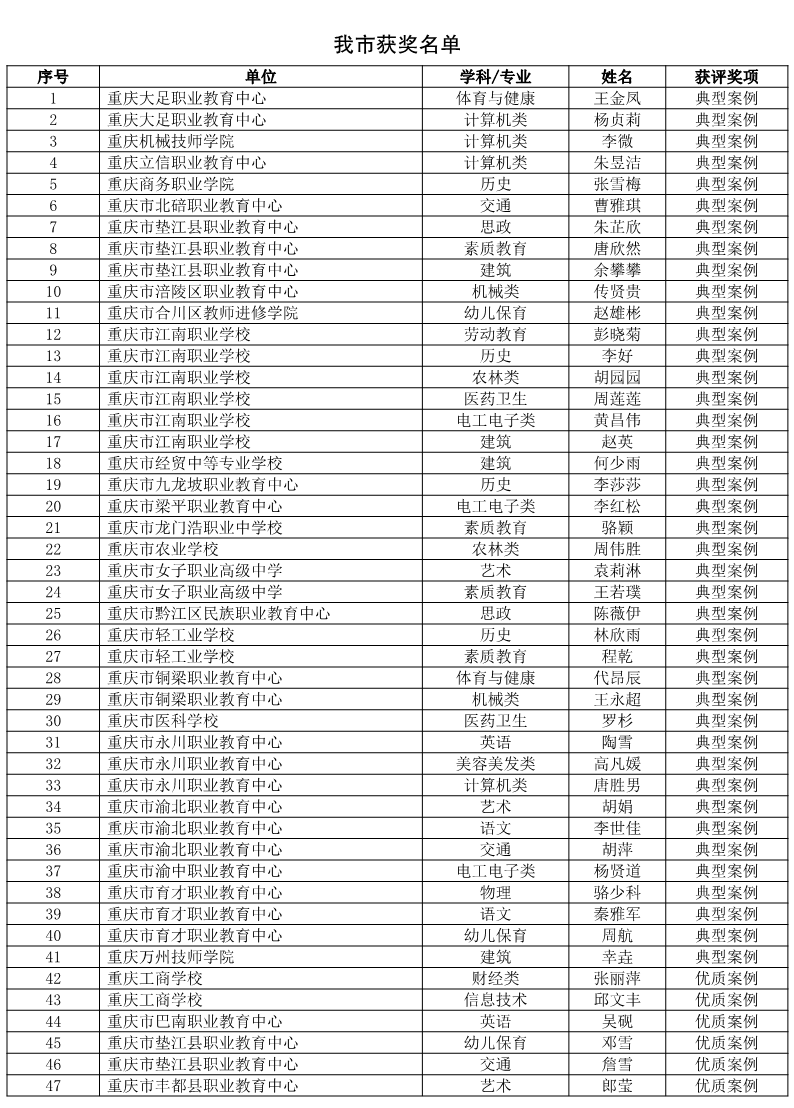 近日,2025年全国中等职业学校教师教学设计与展示活动结束。此次比赛汇聚全国34个省、自治区、直辖市和计划单列市的2492名教师参加,评选出典型案例534项。我市遴选推荐107名教师参与全国展示交流,我市参赛教师凭借扎实的教学功底与出色的教学设计,荣获典型案例41项、优秀案例43项,典型案例总数位居全国第三,获奖率达78.5%。重庆市江南职业学校表现突出,荣获7项典型案例,在全国参展学校中位列第一。此前,重庆市教育科学研究院组织了市级展示暨选拔活动,并开展了全国展示活动培训,对参赛教师进行精准指导。此次活动取得的成绩展现了我市中职教育教学改革的显著成效,反映了我市职业教育教师队伍的专业水平与创新活力。